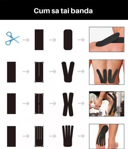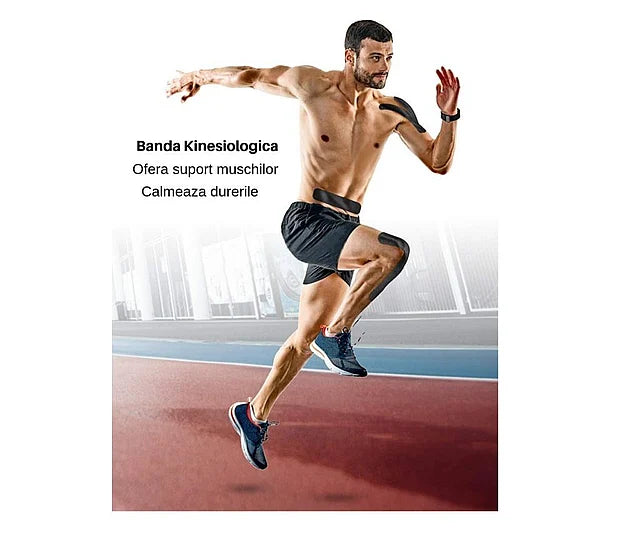 Banda kinesiologica sau plasturele kinesiologic este excelent de adeziva, elastica longitudinal, 97% din bumbac si 3% tesatura ce contine poliuretan, favorabil pielii, prevazuta cu strat adeziv acrilic. Banda kinesiologica ramane pe corp pentru mai multe zile (3-5), respirabil si rezistent la apa.