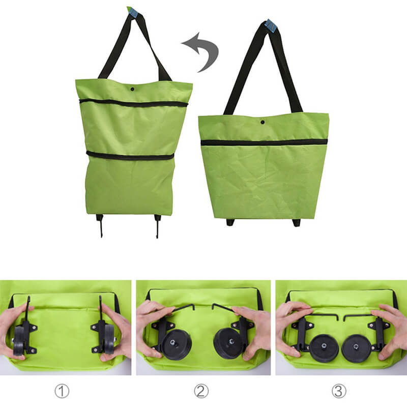 Această sacoșă este concepută pentru a se transforma dintr-o geantă elegantă obișnuită într-o geantă de cumpărături mare cu roți în doar câteva secunde. Designul său unic extensibil îți permite să depozitezi toate produsele și face mersul la cumpărături mai ușor.