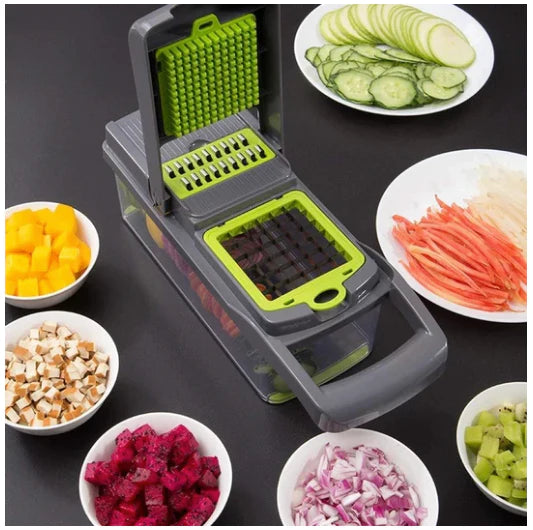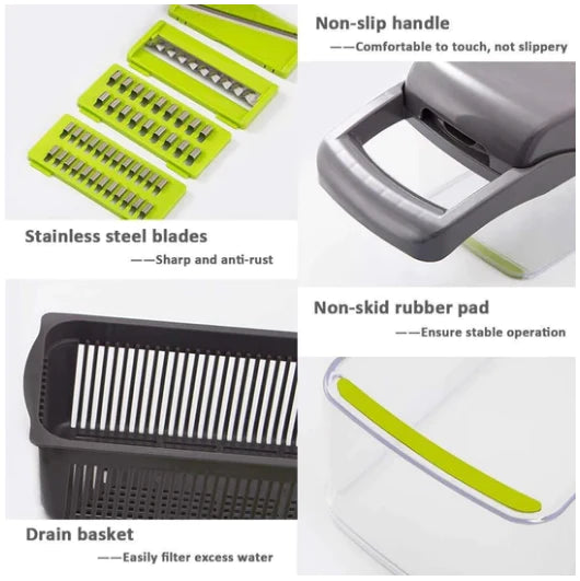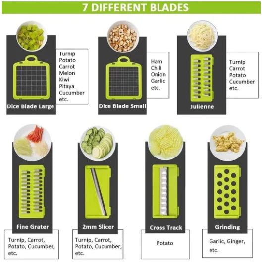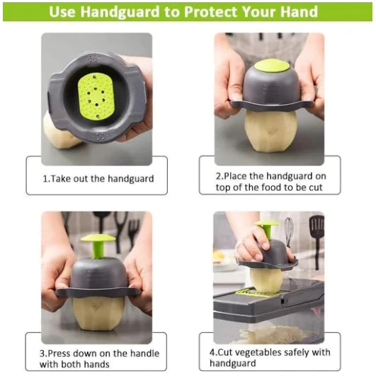Este prevazuta cu 7 accesorii interschimbabile, ideale pentru taiere fina si precisa, in stil julienne, tocare, maruntire, razuire, 1 recipient cu baza antialunecare, 1 protectie pentru mana.