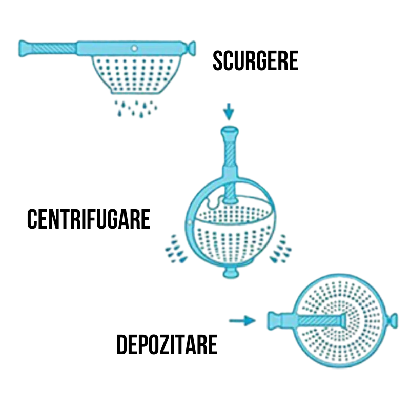 Folositi-va pentru a va scurge pastele si pentru a va clati legumele sau pentru a le rasuci intr-o centrifuga! Nu va mai scuturati sau uscati prin picurare frunzele de salata; manerul cu actionare sus-jos roteste strecuratoarea, uscand produsele in cateva secunde.